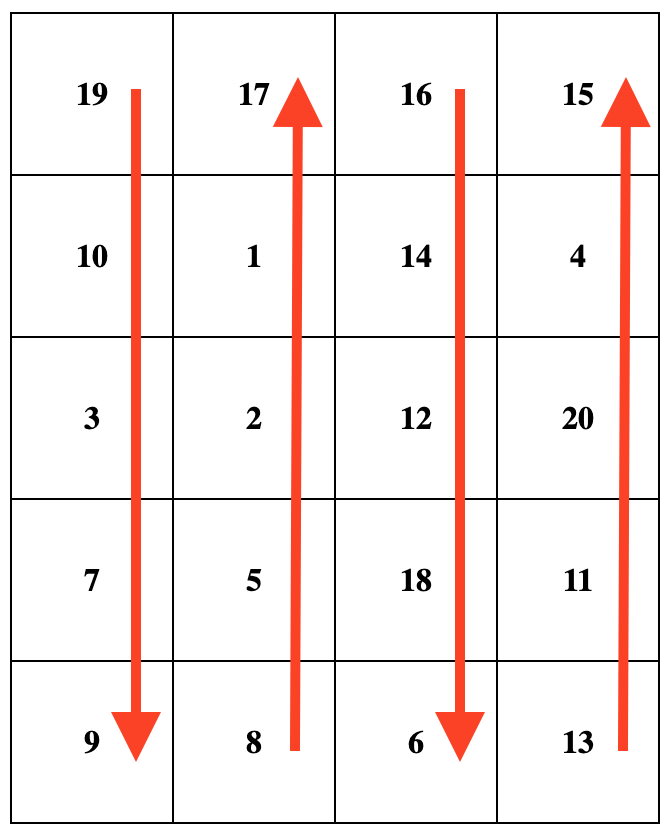 蜗牛排序从左上角的单元格开始,从当前数组的第一个值开始。然后,它从上到下遍历第一列,接着移动到右边的下一列,并从下到上遍历它。将这种模式持续下去,每列交替变换遍历方向,直到覆盖整个数组。例如,当给定输入数组 [19, 10, 3, 7, 9, 8, 5, 2, 1, 17, 16, 14, 12, 18, 6, 13, 11, 20, 4, 15] ,当 rowsCount = 5 且 colsCount = 4 时,需要输出矩阵如下图所示。注意,矩阵沿箭头方向对应于原数组中数字的顺序